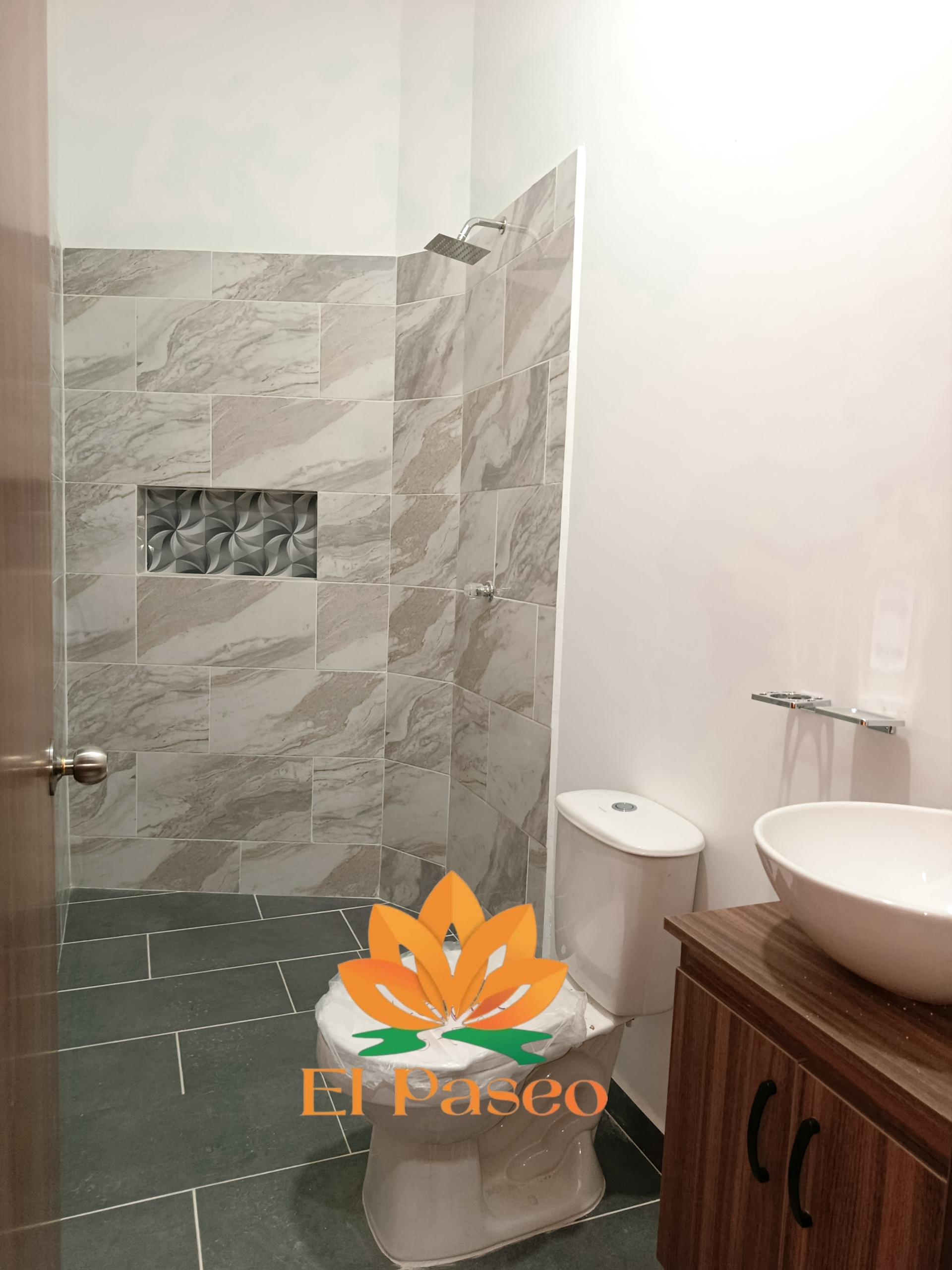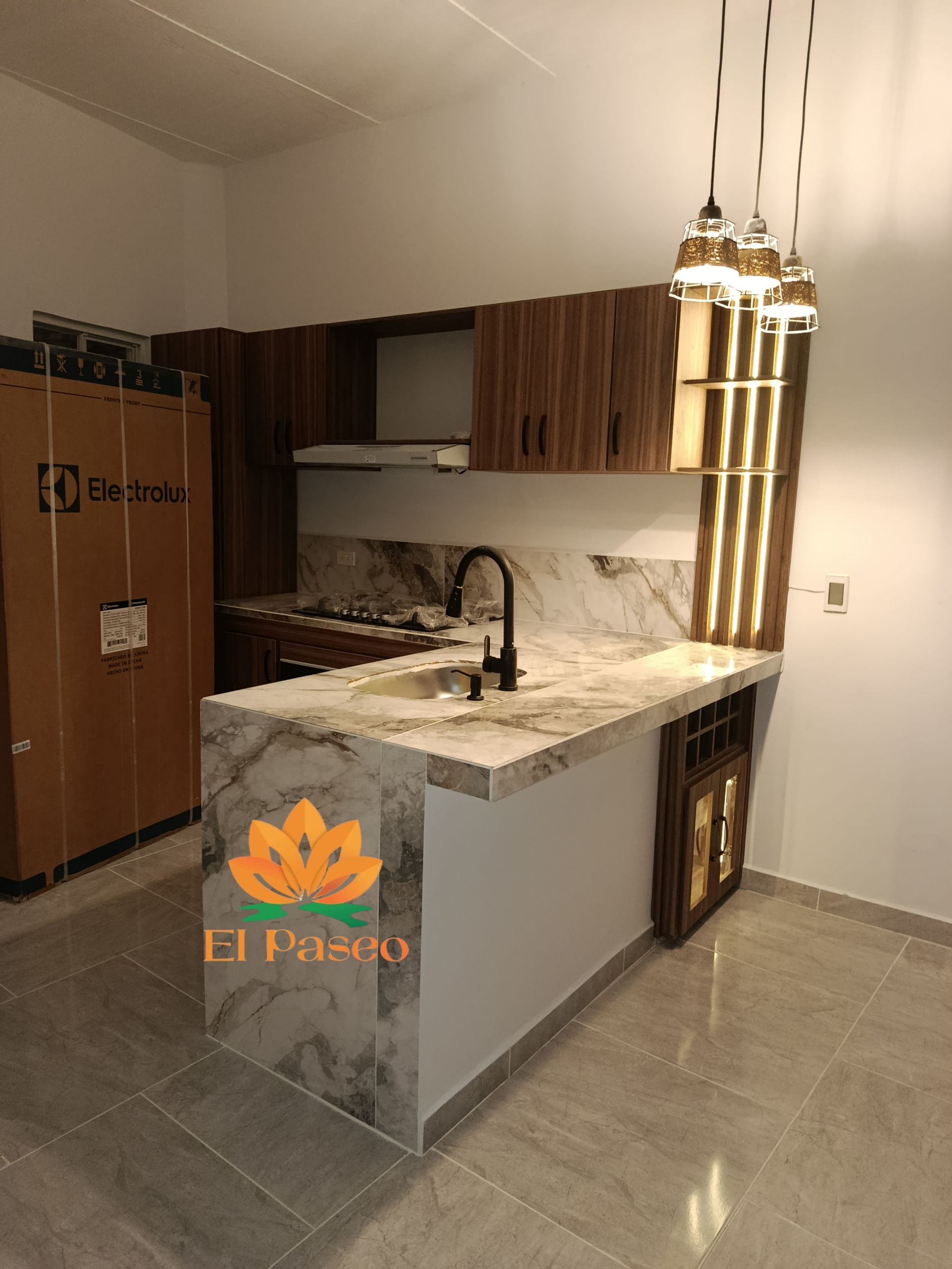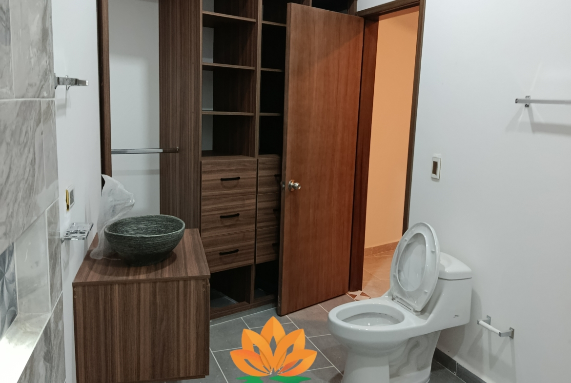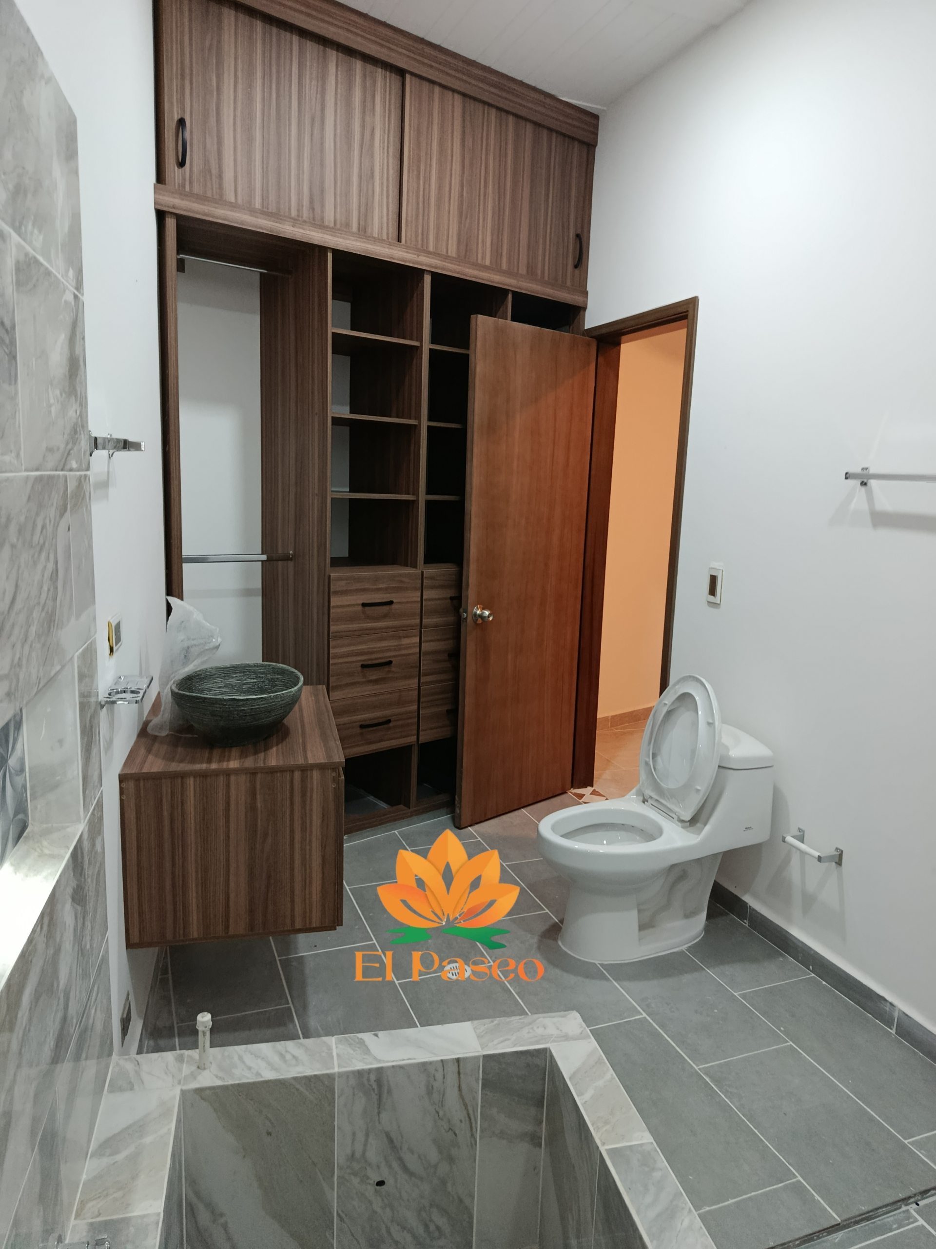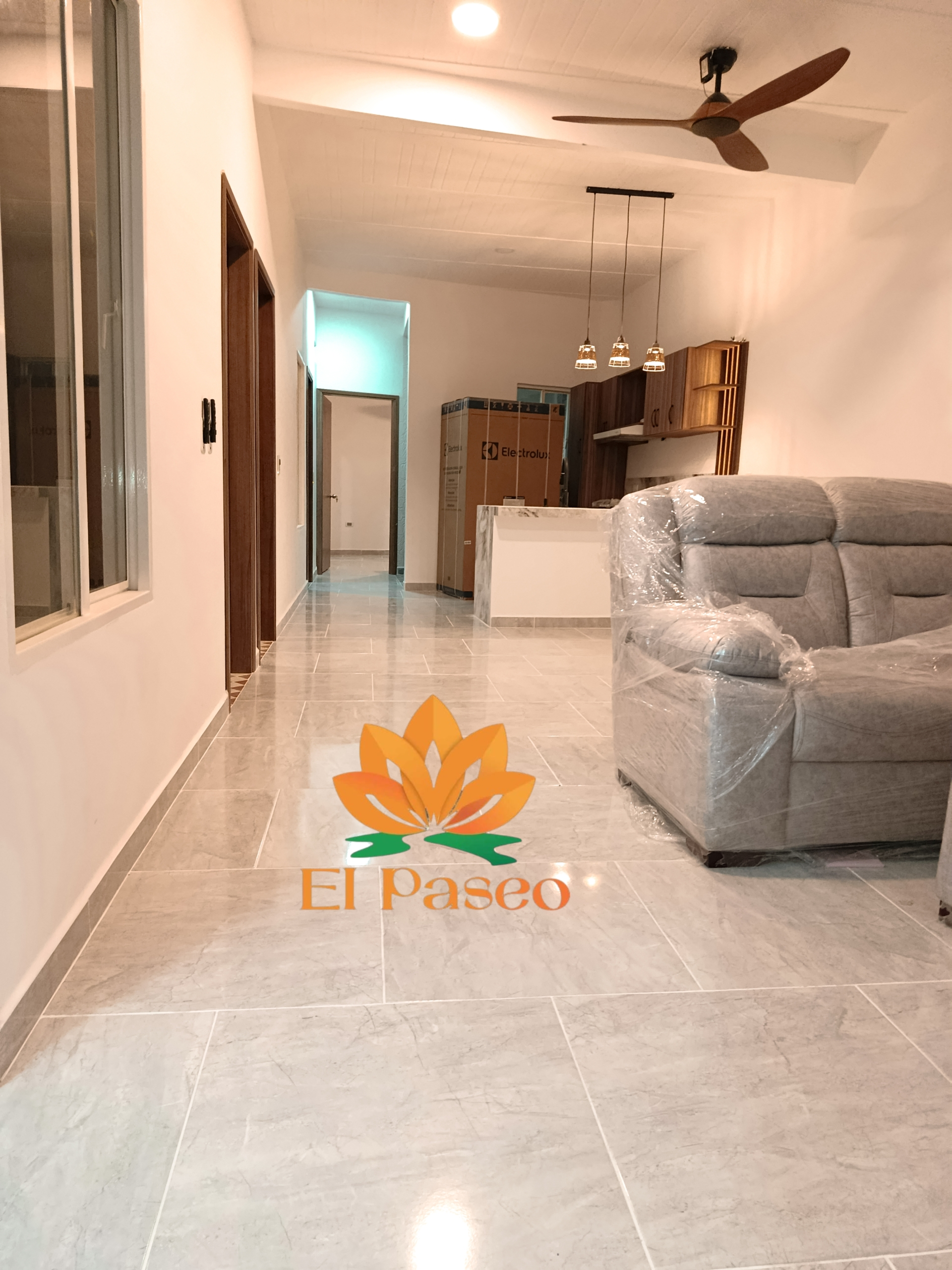 3 alcobas, 2 baños (privado con tina y social), 1 cocina tipo americana, 1 salón comedor, 1 estudio y cuarto San Alejo, 1 patio de ropas, 1 garaje amplio para 2 carros + jardinera, maderas 100%, plancha para 2 pisos + cubierta de protección