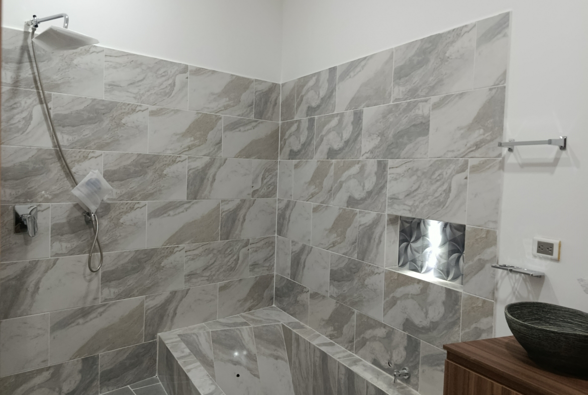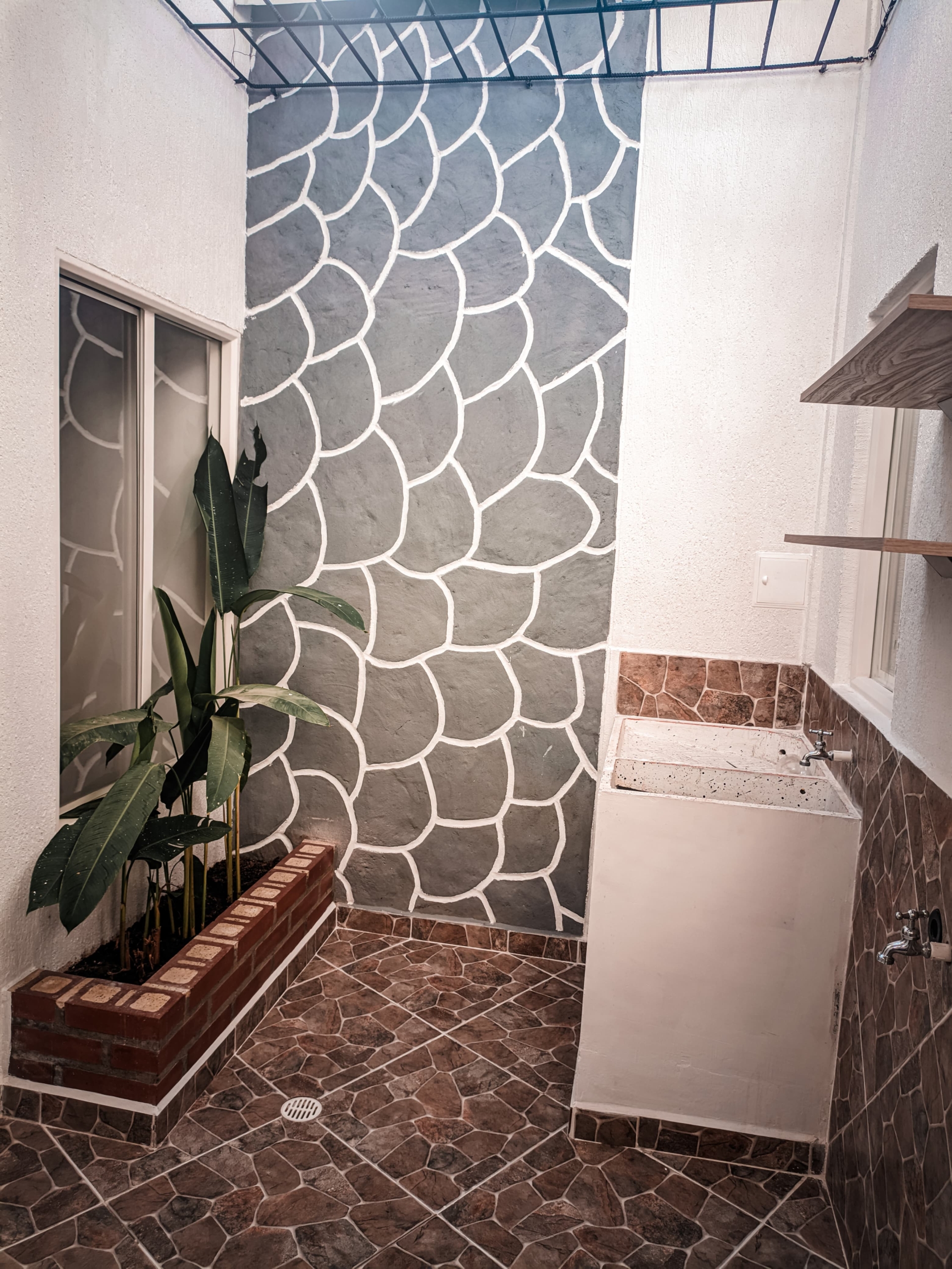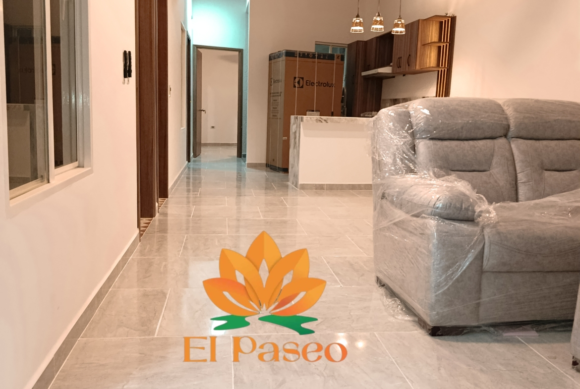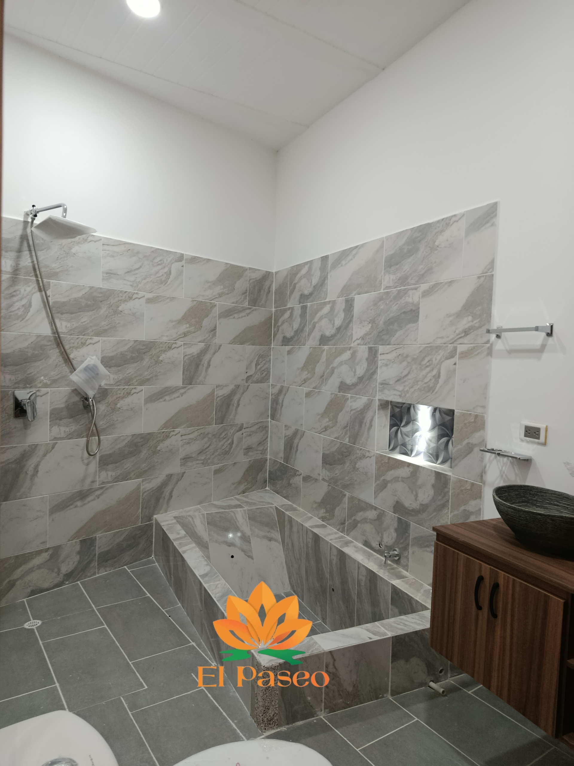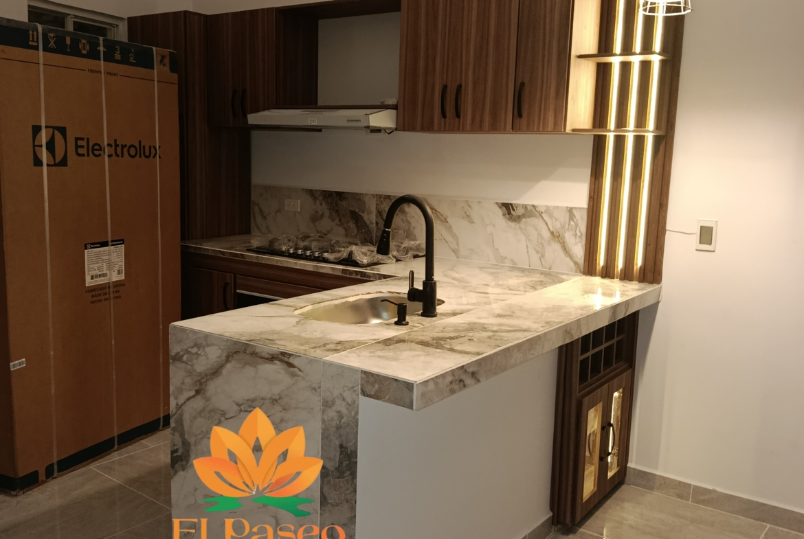 3 alcobas, 2 baños (privado con tina y social), 1 cocina tipo americana, 1 salón comedor, 1 estudio y cuarto San Alejo, 1 patio de ropas, 1 garaje amplio para 2 carros + jardinera, maderas 100%, plancha para 2 pisos + cubierta de protección